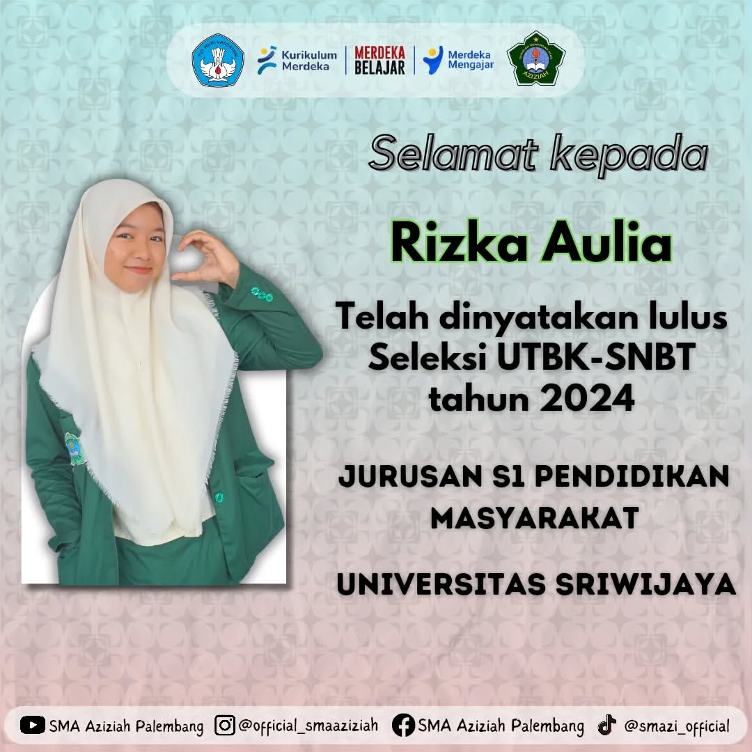 Selamat kepada salah satu siswi SMA Aziziah Palembang, Rizka Aulia, yang telah dinyatakan lulus seleksi UTBK-SNBT 2024 di kampus impian👏